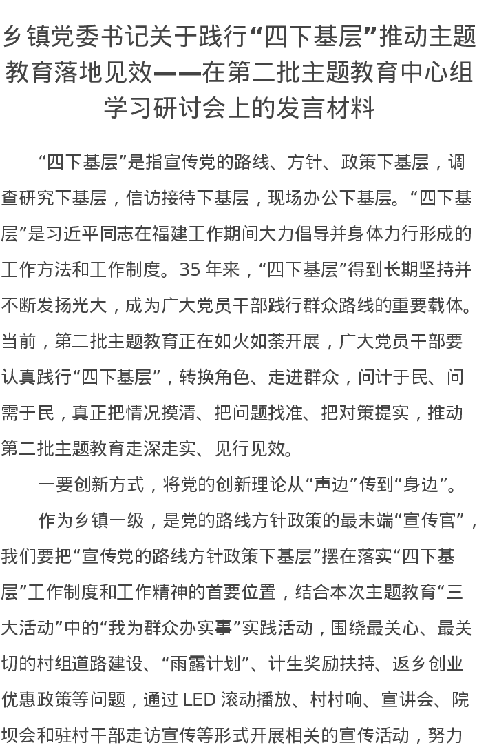 乡镇党委书记关于践行“四下基层”推动主题教育落地见效——在第二批主题教育中心组学习研讨会上的发言材料(特色社会主义思想)