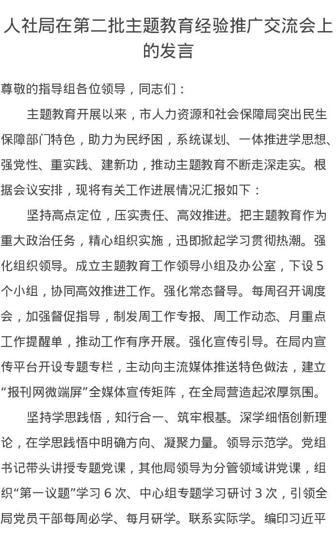人社局在第二批主题教育经验推广交流会上的发言(特色社会主义思想)