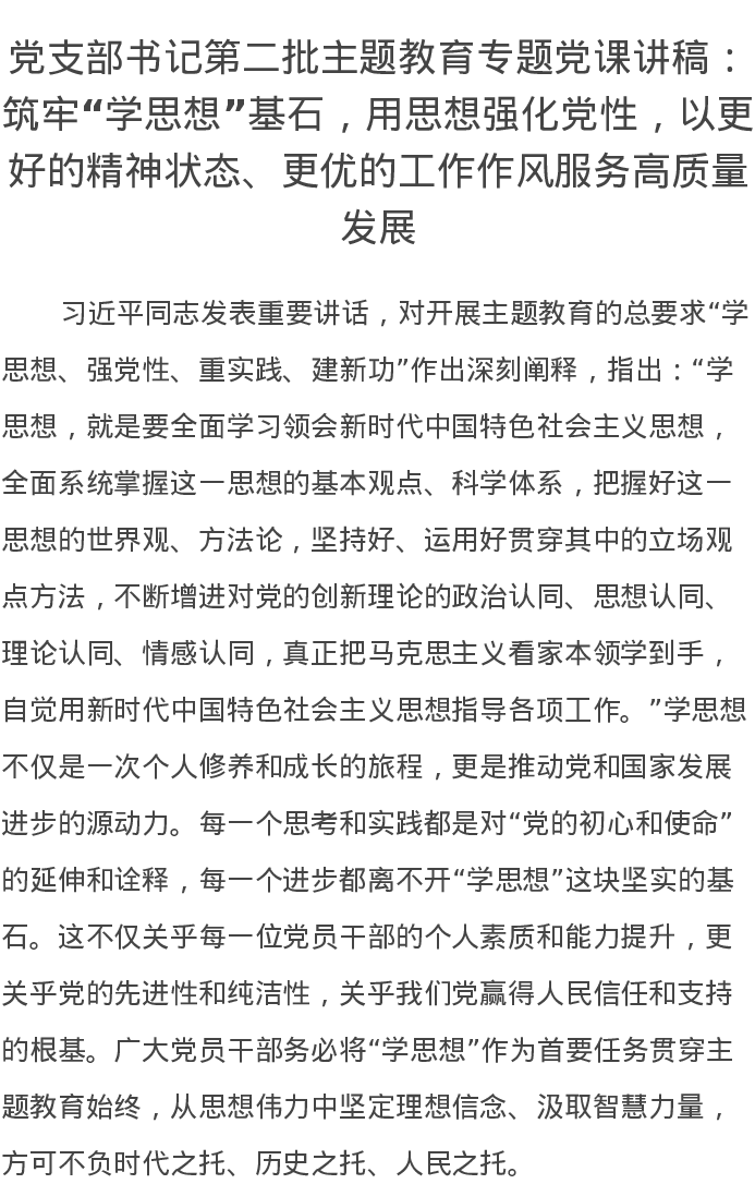 党支部书记第二批主题教育专题党课讲稿:筑牢“学思想”基石,用思想强化党性,以更好的精神状态、更优的工作作风服务高质量发展(特色社会主义思想)