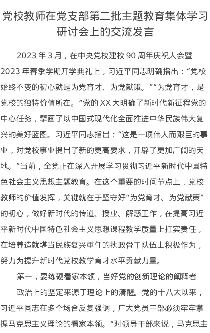 党校教师在党支部第二批主题教育集体学习研讨会上的交流发言