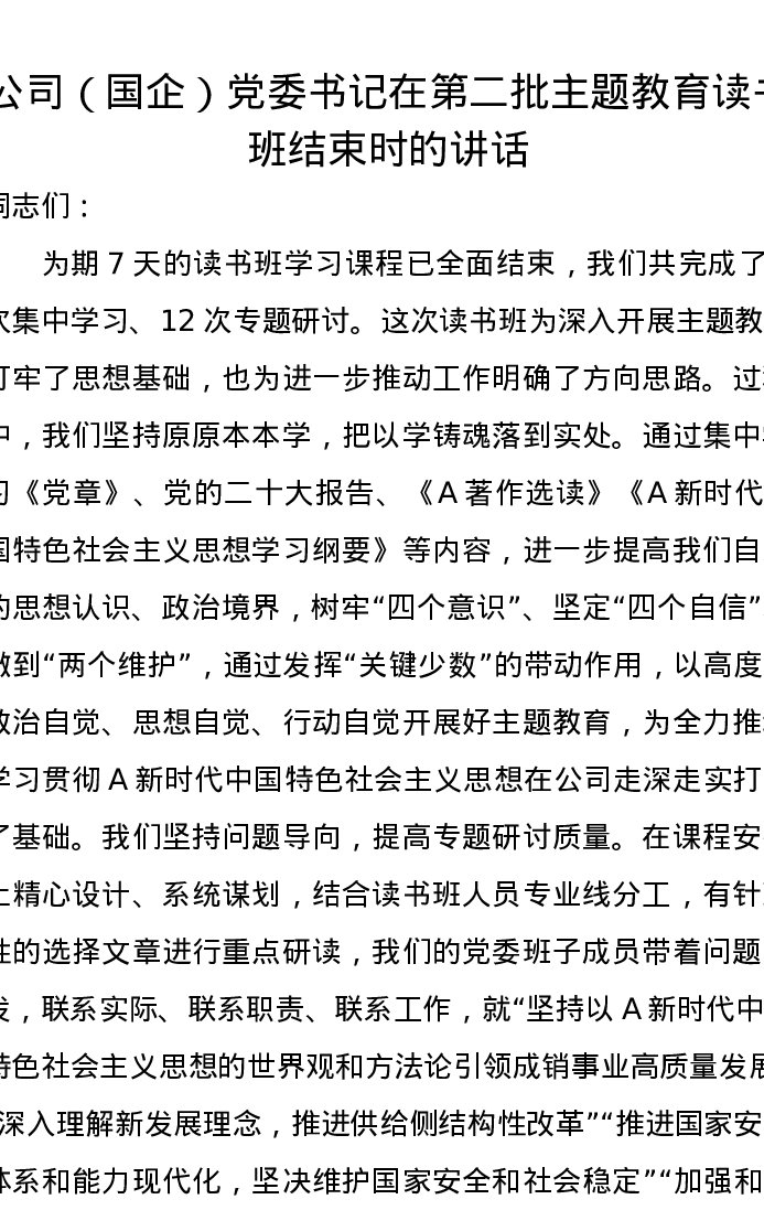 公司(国企)党委书记在第二批主题教育读书班结束时的讲话(特色社会主义思想)