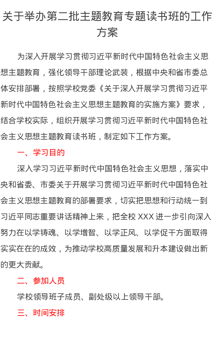关于举办第二批主题教育专题读书班的工作方案(特色社会主义思想)