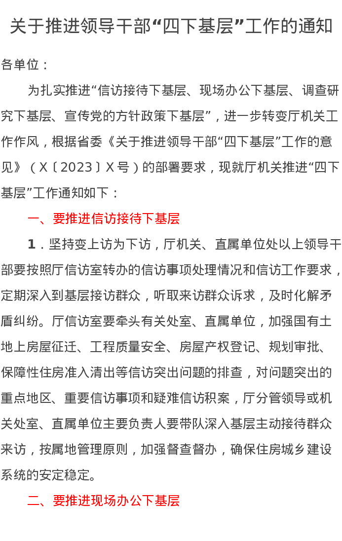 关于推进领导干部“四下基层”工作的通知(特色社会主义思想)主题教育