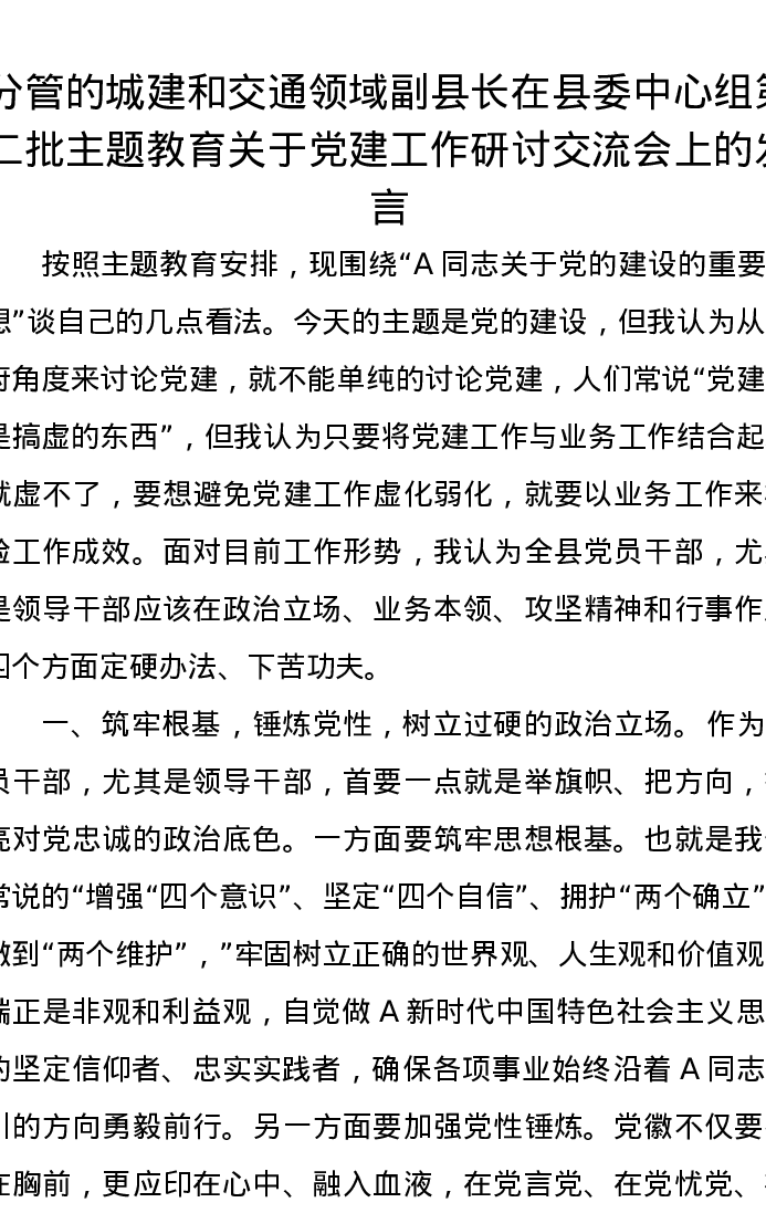 分管的城建和交通领域副县长在县委中心组第二批主题教育关于党建工作研讨交流会上的发言(特色社会主义思想)