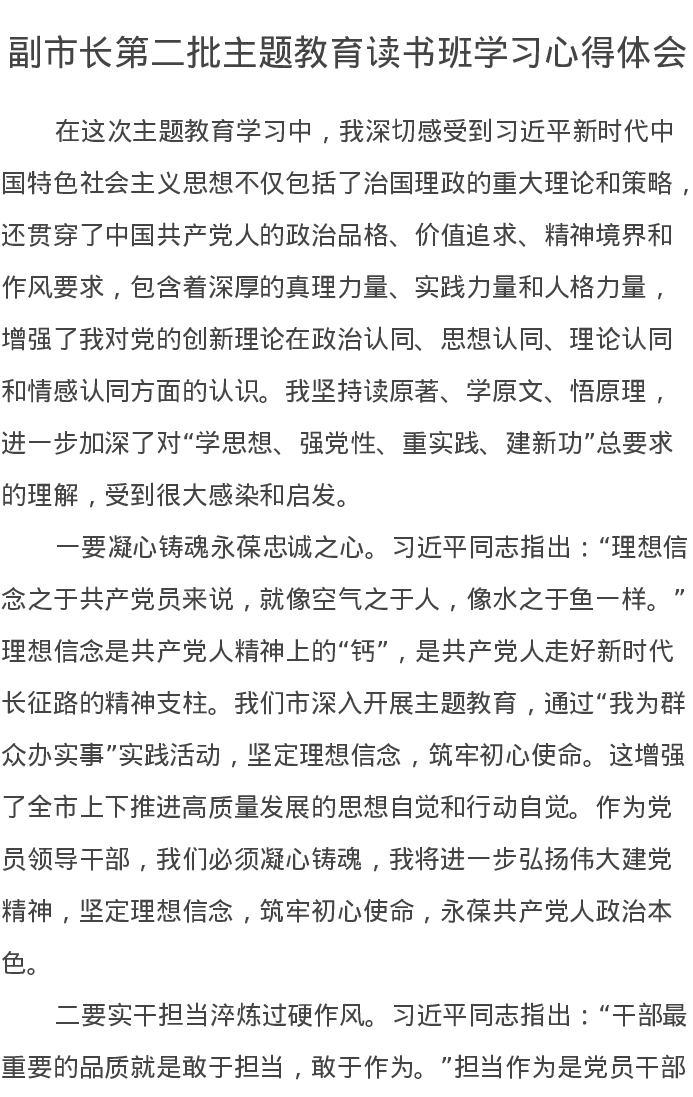 副市长第二批主题教育读书班学习心得体会(特色社会主义思想)