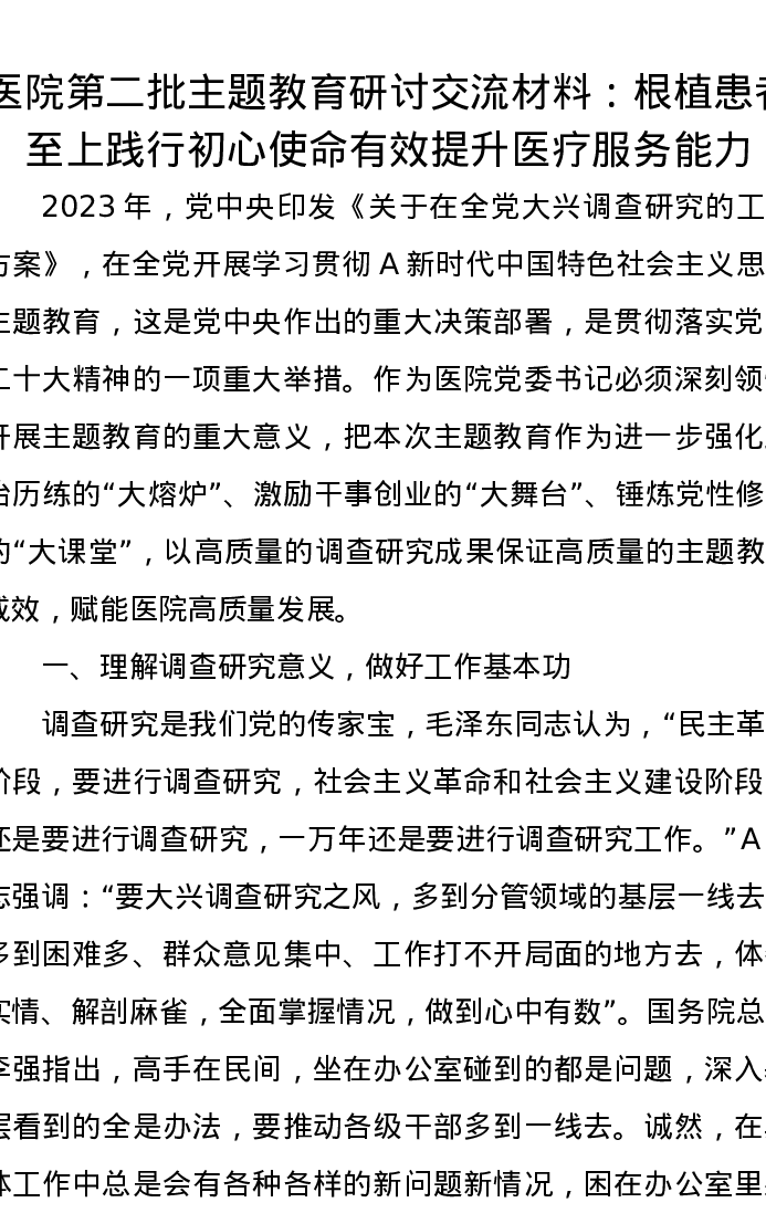 医院第二批主题教育研讨交流材料:根植患者至上践行初心使命有效提升医疗服务能力(特色社会主义思想)