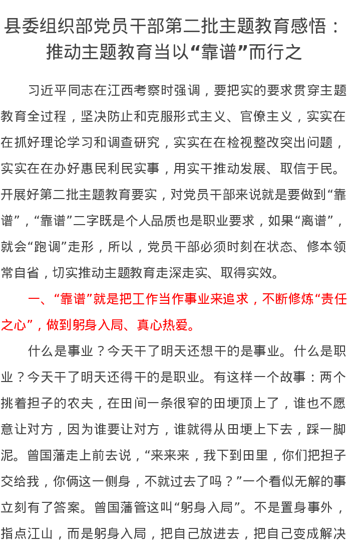 县委组织部党员干部第二批主题教育感悟:推动主题教育当以“靠谱”而行之(特色社会主义思想)