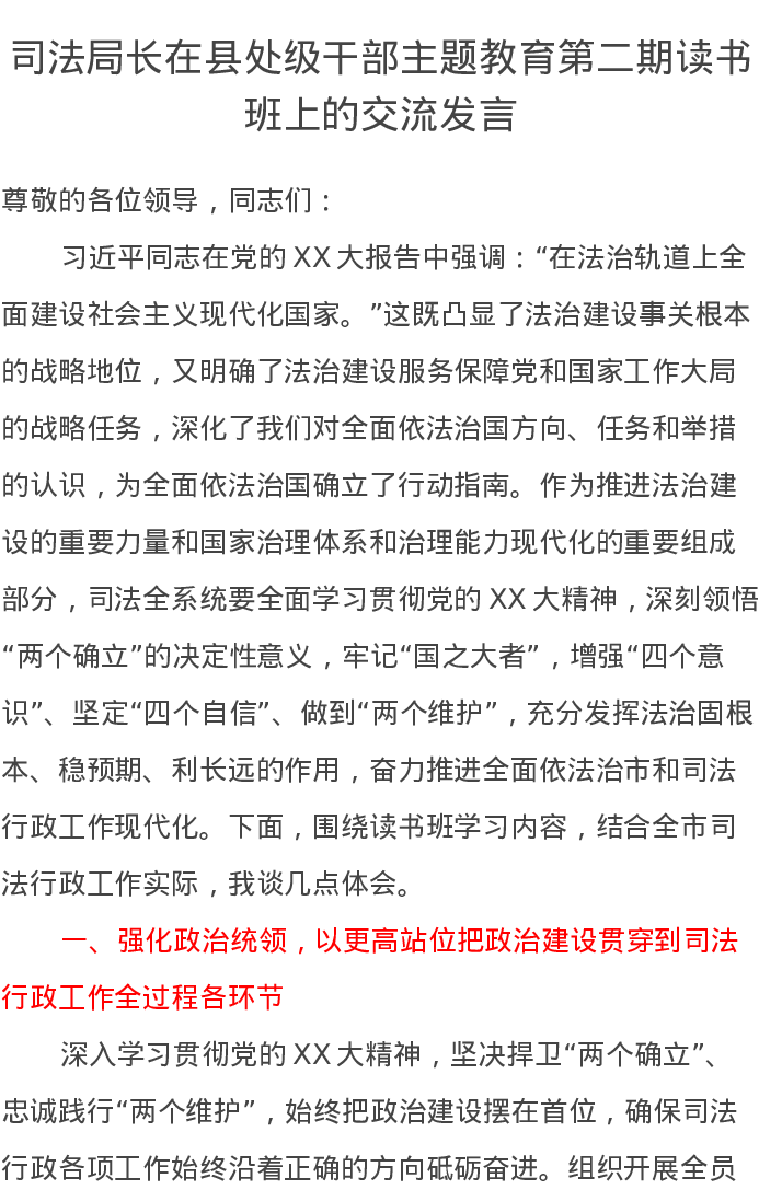 司法局长在县处级干部主题教育第二期读书班上的交流发言(特色社会主义思想)