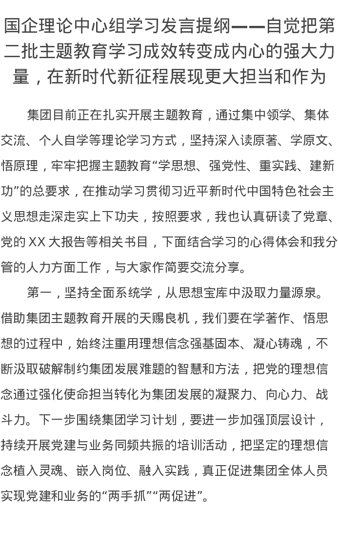 国企理论中心组学习发言提纲——自觉把第二批主题教育学习成效转变成内心的强大力量,在新时代新征程展现更大担当和作为(特色社会主义思想)