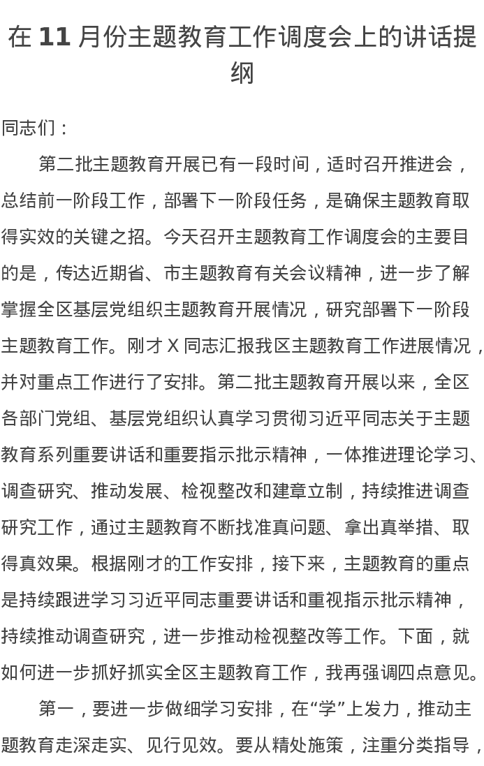 在11月份第二批主题教育工作调度会上的讲话提纲(特色社会主义思想)
