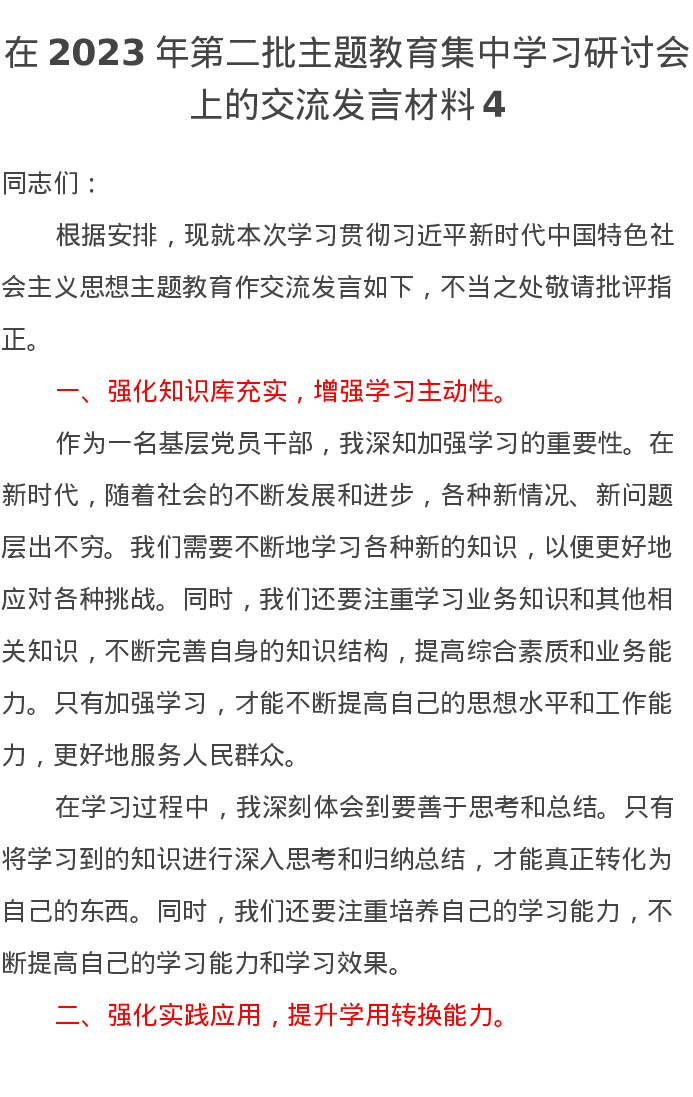 在2023年第二批主题教育集中学习研讨会上的交流发言材料4(特色社会主义思想)