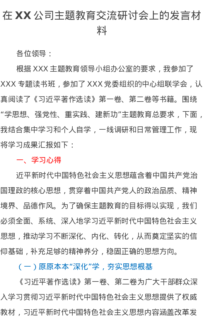 在XX公司主题教育交流研讨会上的发言材料(特色社会主义思想)