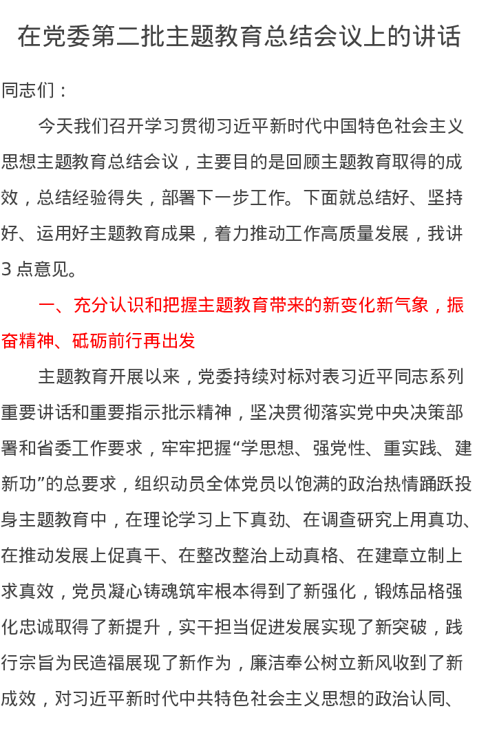 在党委第二批主题教育总结会议上的讲话(特色社会主义思想)