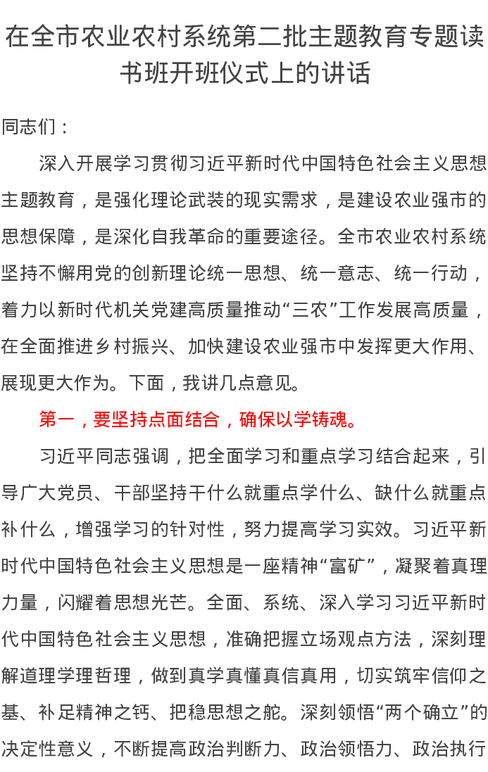在全市农业农村系统第二批主题教育专题读书班开班仪式上的讲话(特色社会主义思想)