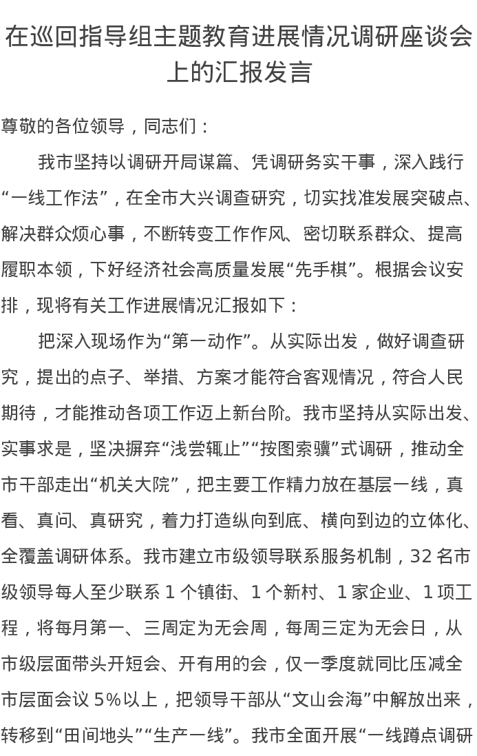 在巡回指导组第二批主题教育进展情况调研座谈会上的汇报发言(特色社会主义思想)