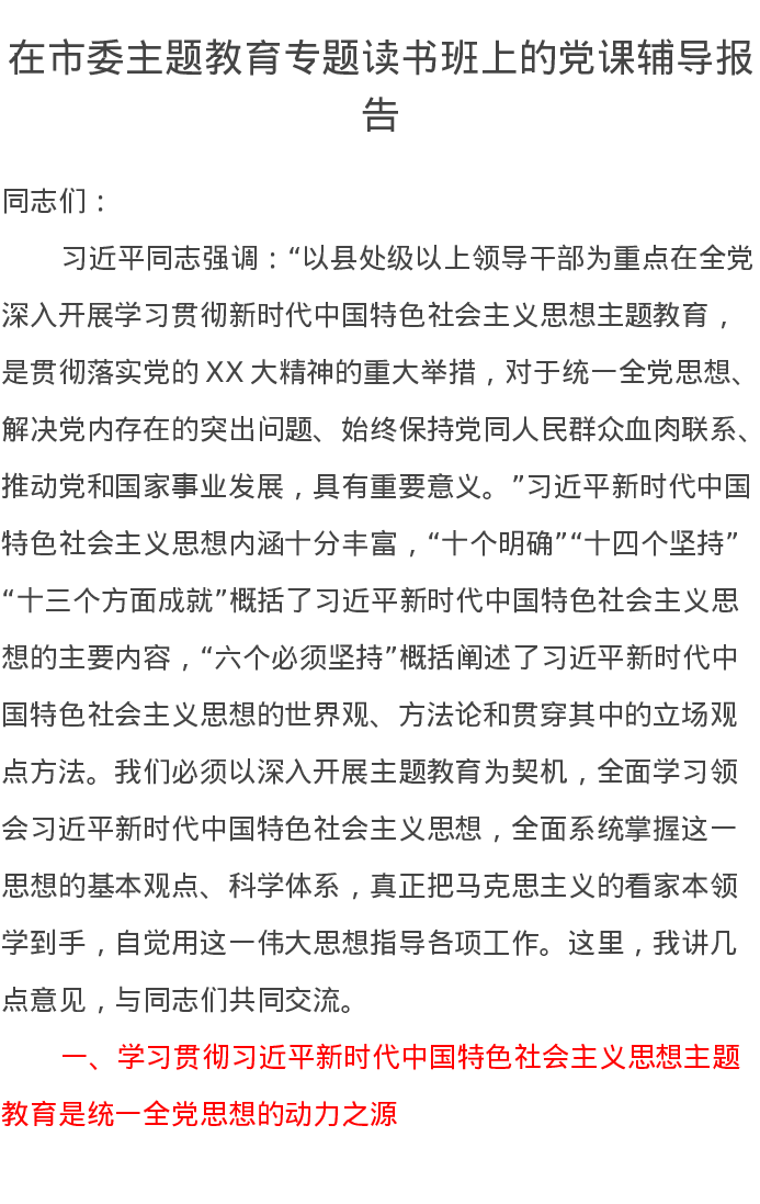 在市委第二批主题教育专题读书班上的党课辅导报告(特色社会主义思想)