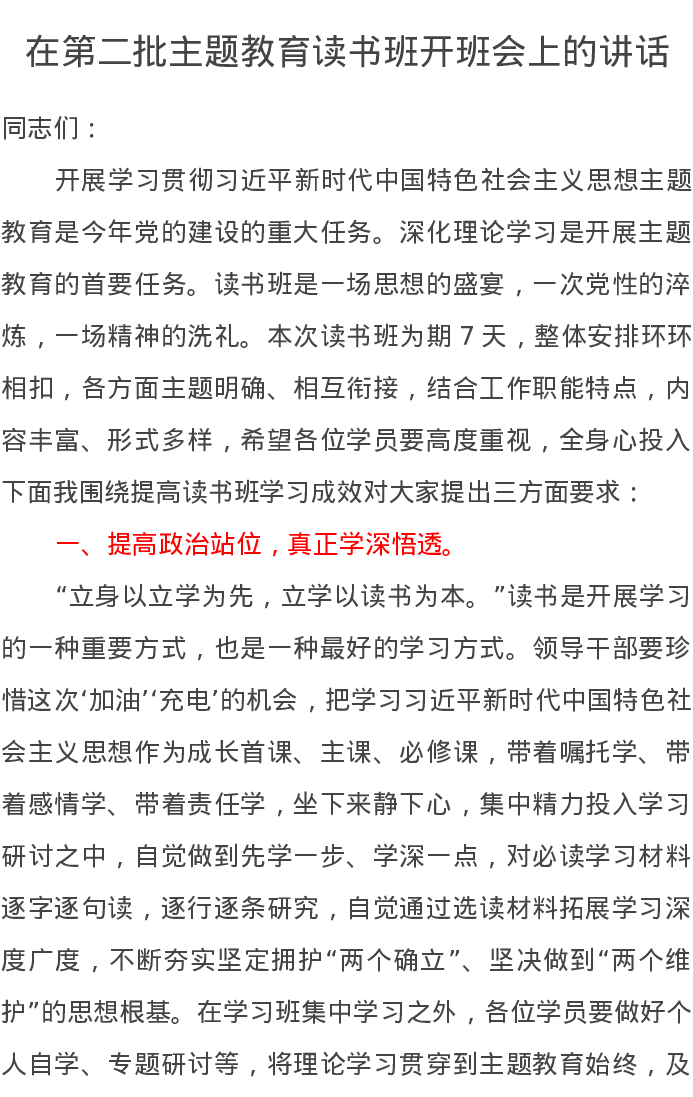 在第二批主题教育读书班开班会上的讲话(特色社会主义思想)