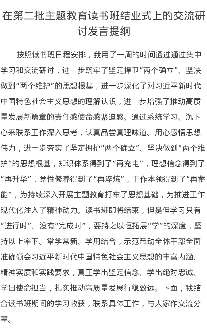 在第二批主题教育读书班结业式上的交流研讨发言提纲(特色社会主义思想)