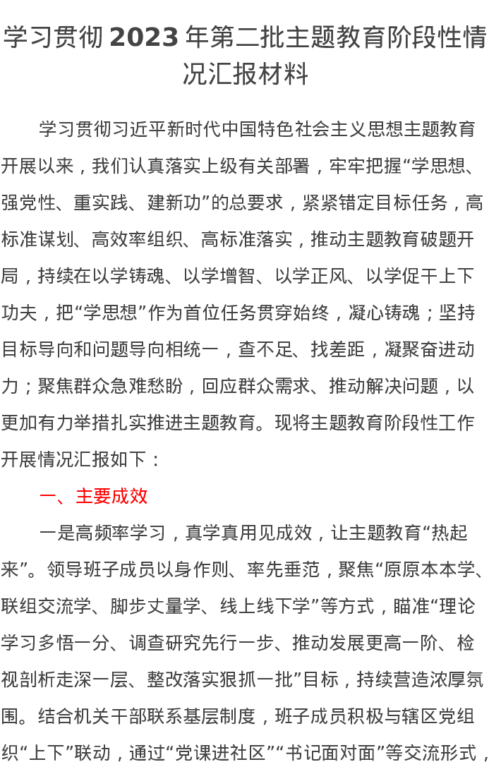 学习贯彻2023年第二批主题教育阶段性情况汇报材料(特色社会主义思想)