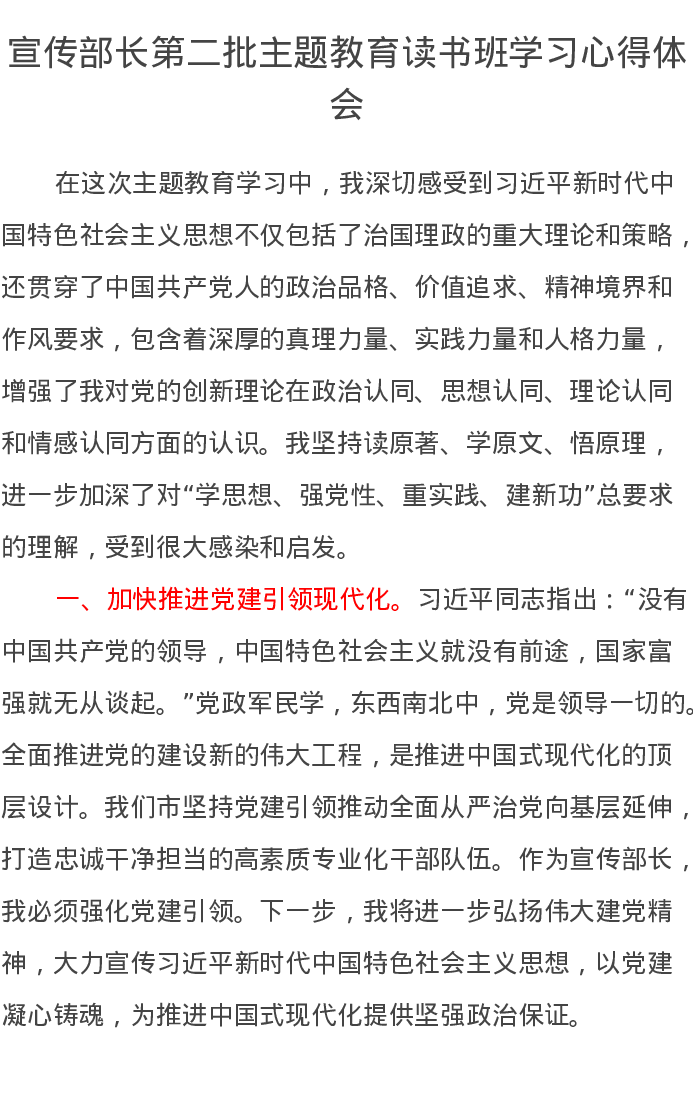 宣传部长第二批主题教育读书班学习心得体会(特色社会主义思想)