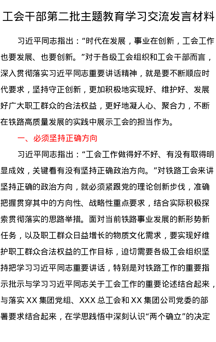 工会干部第二批主题教育学习交流发言材料(特色社会主义思想)