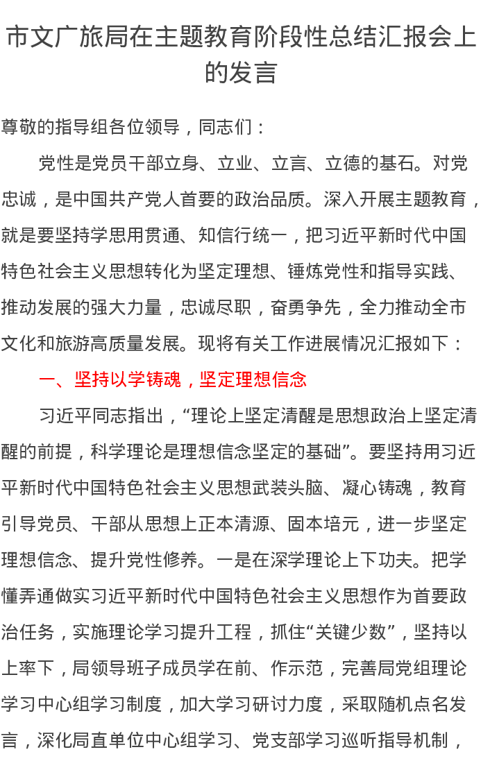 市文广旅局在第二批主题教育阶段性总结汇报会上的发言(特色社会主义思想)
