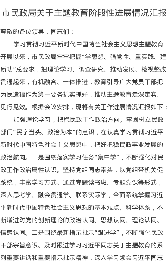 市民政局关于第二批主题教育阶段性进展情况汇报(特色社会主义思想)