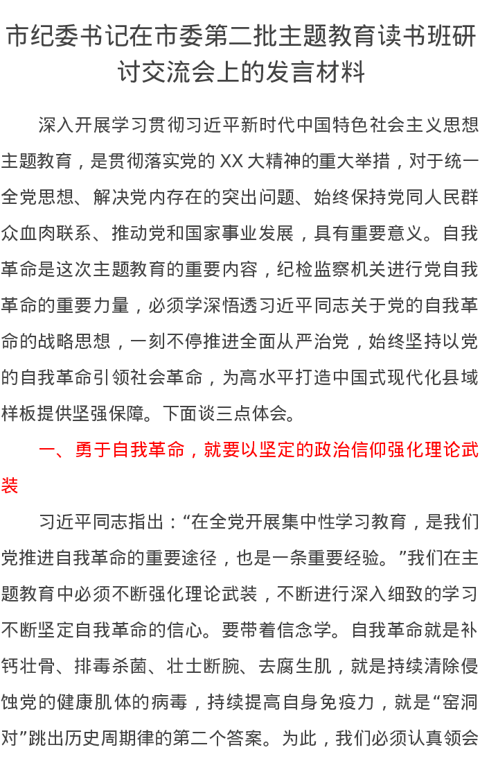 市纪委书记在市委第二批主题教育读书班研讨交流会上的发言材料(特色社会主义思想)