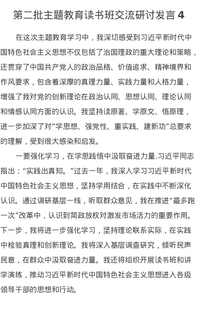 干部第二批主题教育读书班交流研讨发言4(特色社会主义思想)