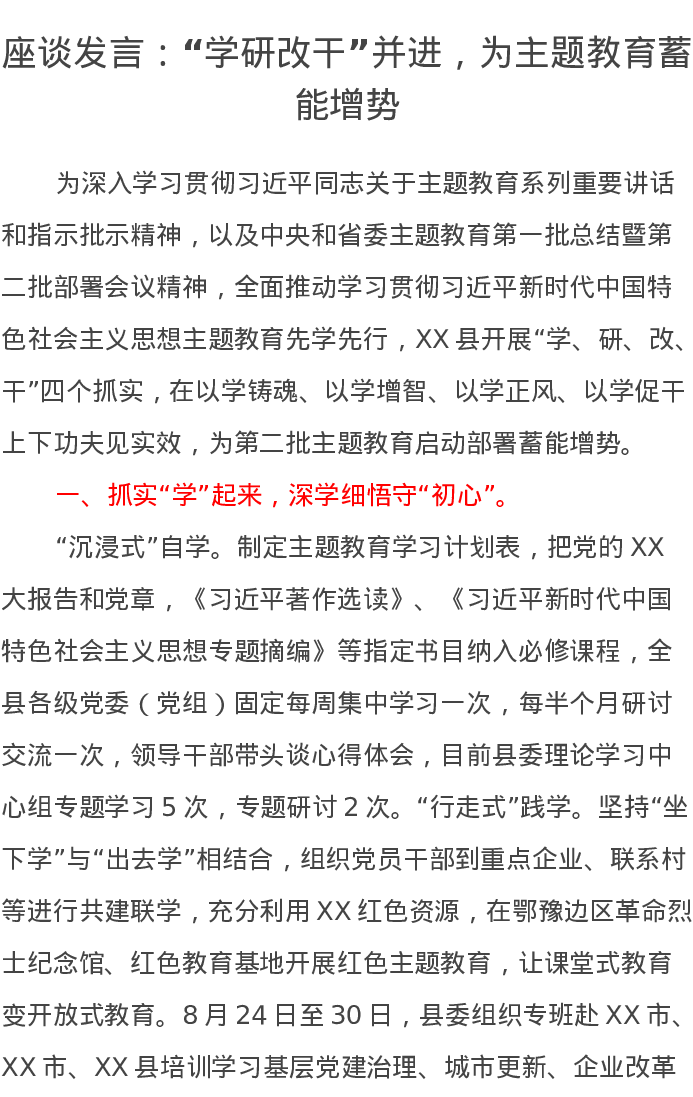 座谈发言:“学研改干”并进,为主题教育蓄能增势(特色社会主义思想)
