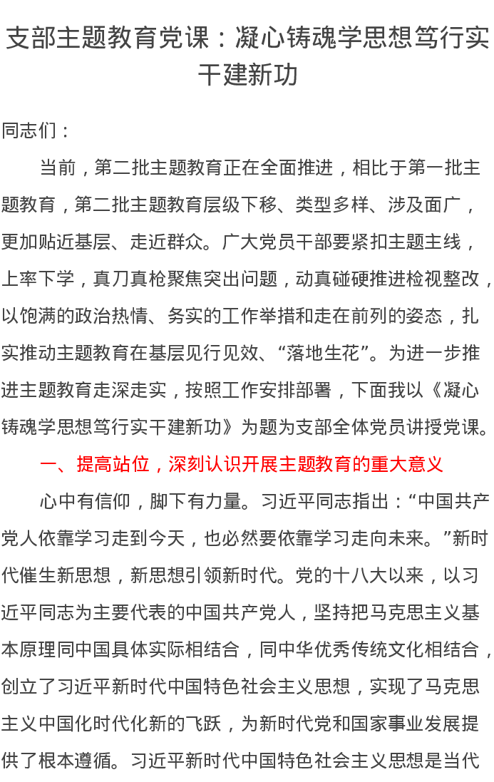 支部第二批主题教育党课讲稿:凝心铸魂学思想笃行实干建新功(特色社会主义思想)