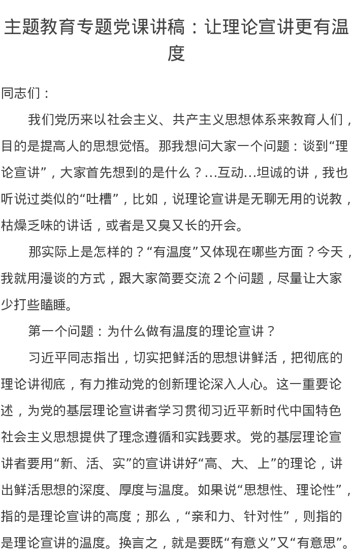 第二批主题教育专题党课讲稿:让理论宣讲更有温度(特色社会主义思想)