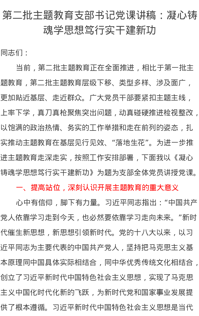 第二批主题教育支部书记党课讲稿:凝心铸魂学思想笃行实干建新功(特色社会主义思想)