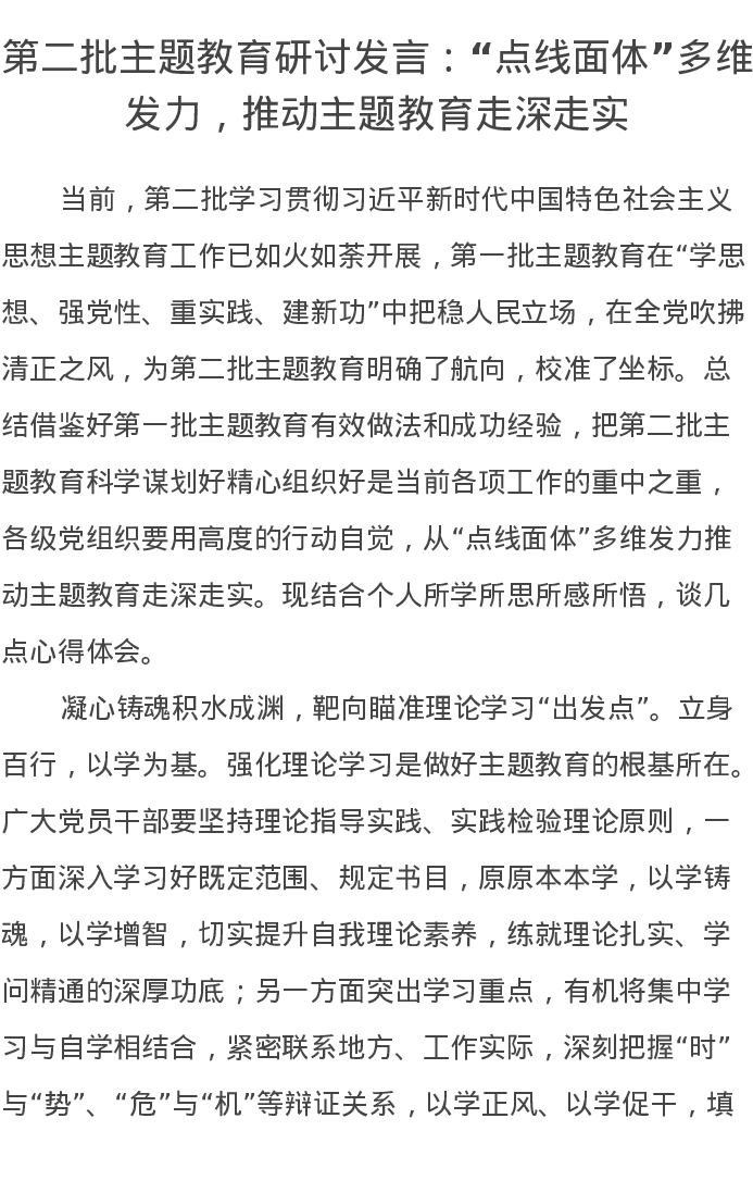 第二批主题教育研讨发言:“点线面体”多维发力,推动主题教育走深走实(特色社会主义思想)