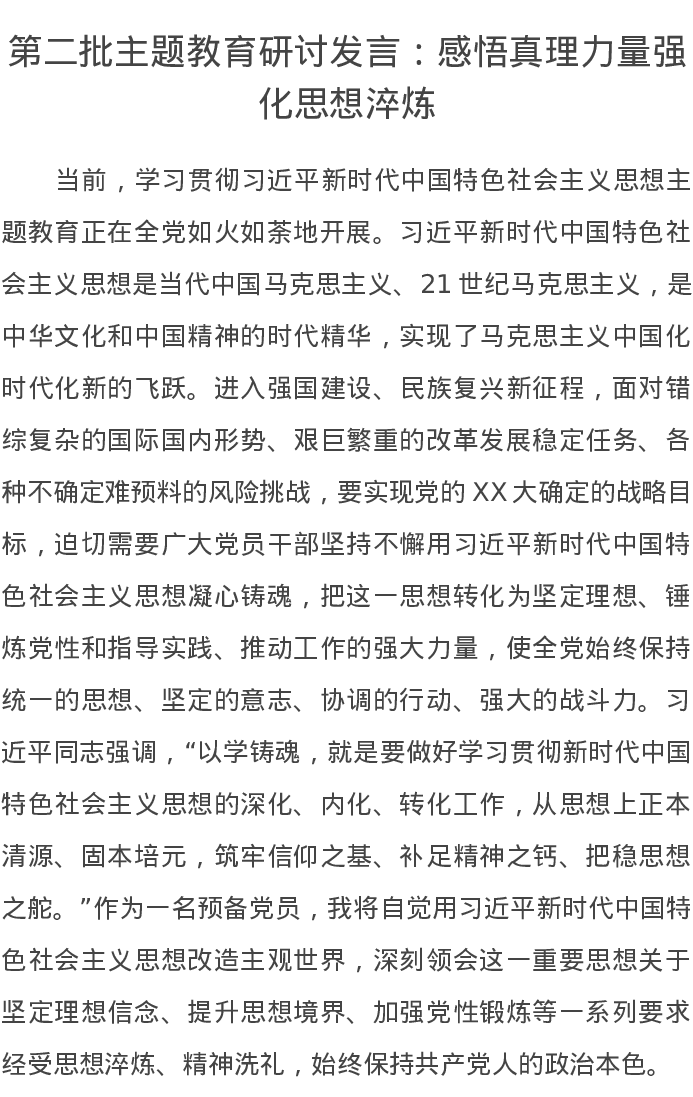 第二批主题教育研讨发言:感悟真理力量强化思想淬炼(特色社会主义思想)
