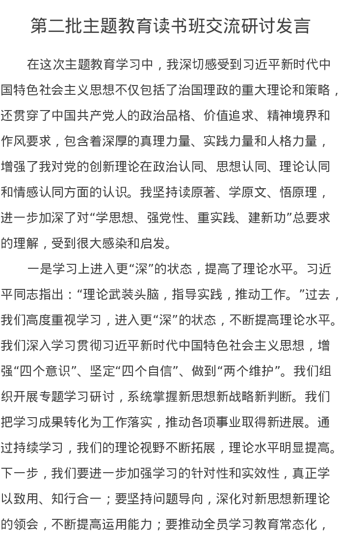 第二批主题教育读书班交流研讨发言(特色社会主义思想)