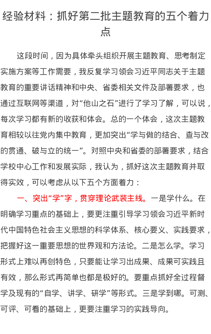 经验材料:抓好第二批主题教育的五个着力点(特色社会主义思想)
