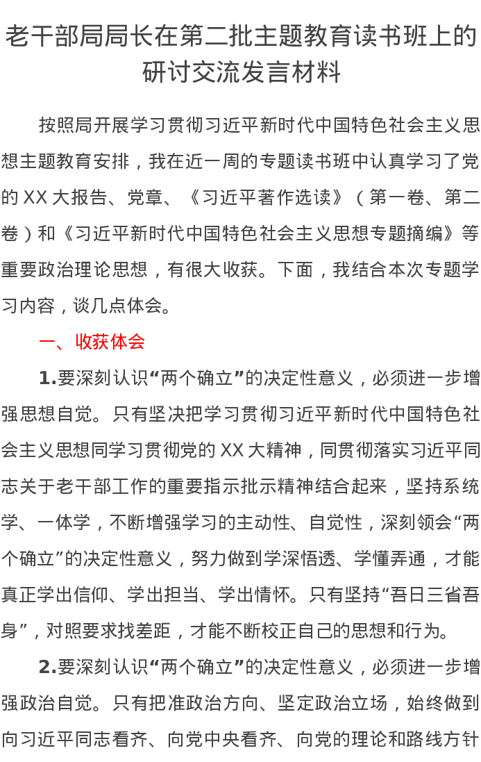 老干部局局长在第二批主题教育读书班上的研讨交流发言材料(特色社会主义思想)
