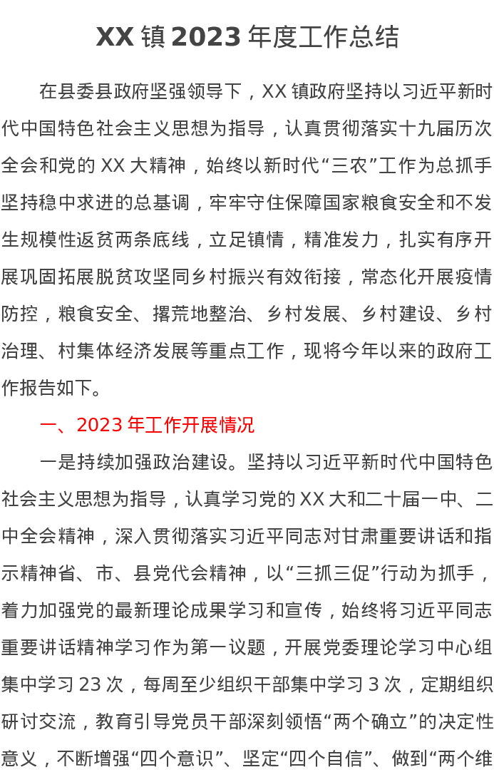 XX镇2023年度工作总结