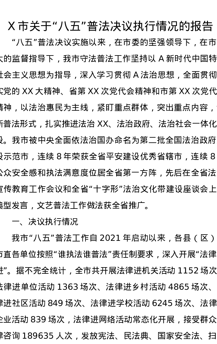 X市关于“八五”普法决议执行情况的报告