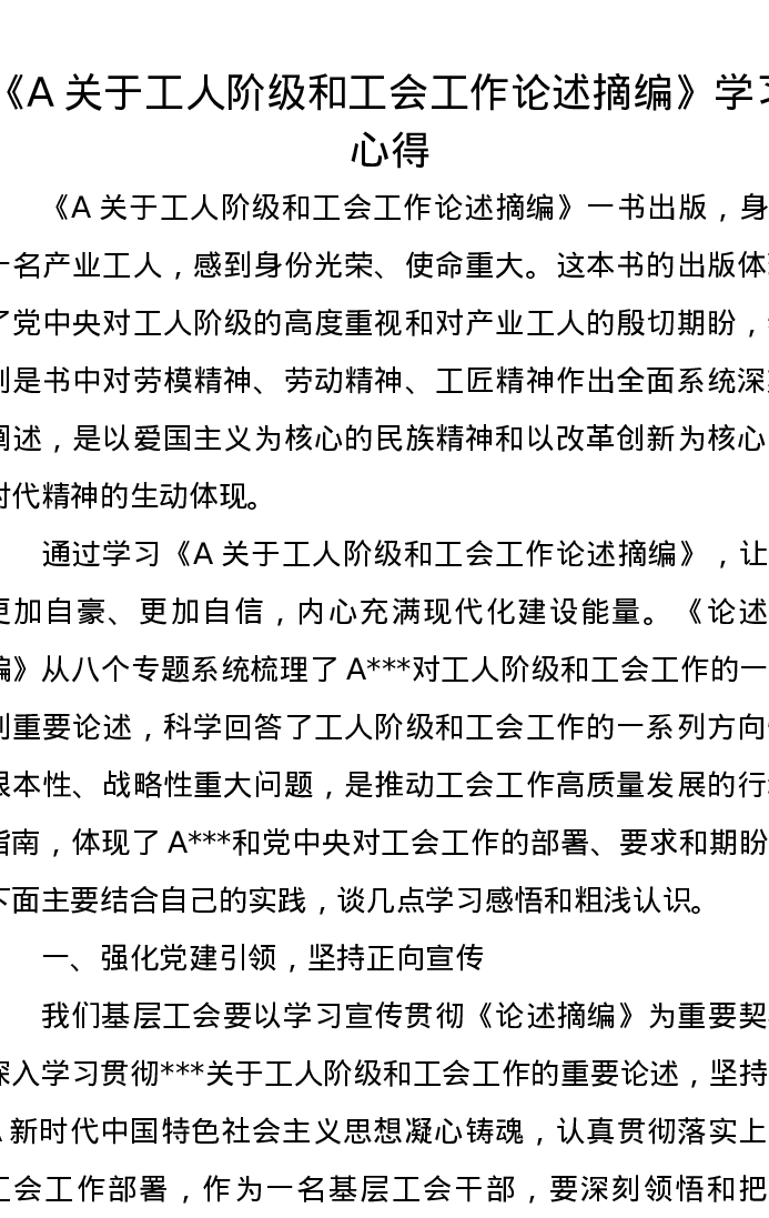 《A关于工人阶级和工会工作论述摘编》学习心得