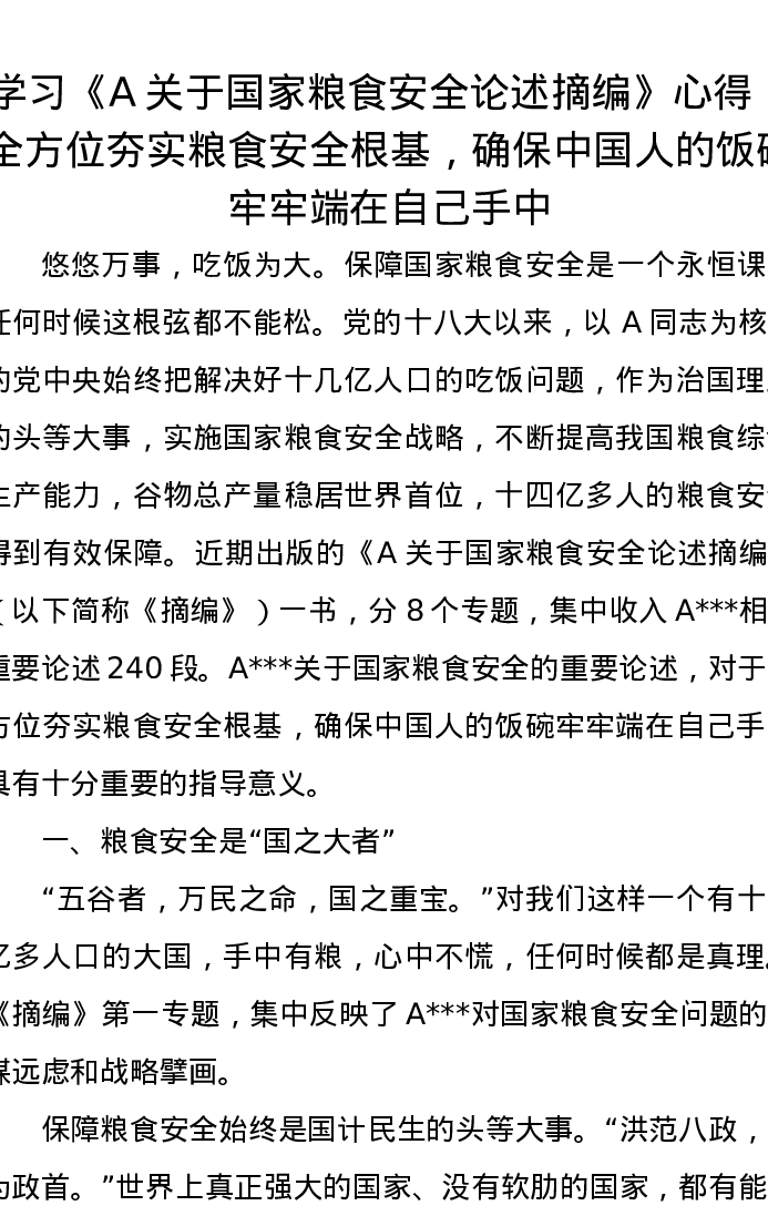 学习《A关于国家粮食安全论述摘编》心得:全方位夯实粮食安全根基,确保中国人的饭碗牢牢端在自己手中