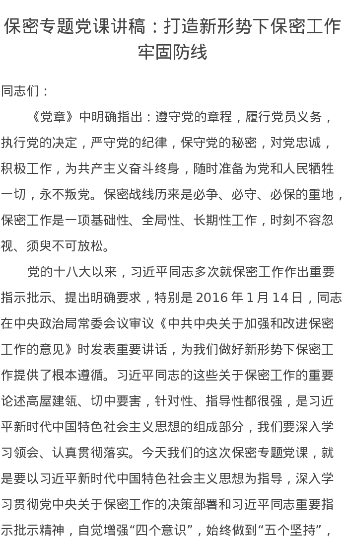 保密专题党课讲稿:打造新形势下保密工作牢固防线