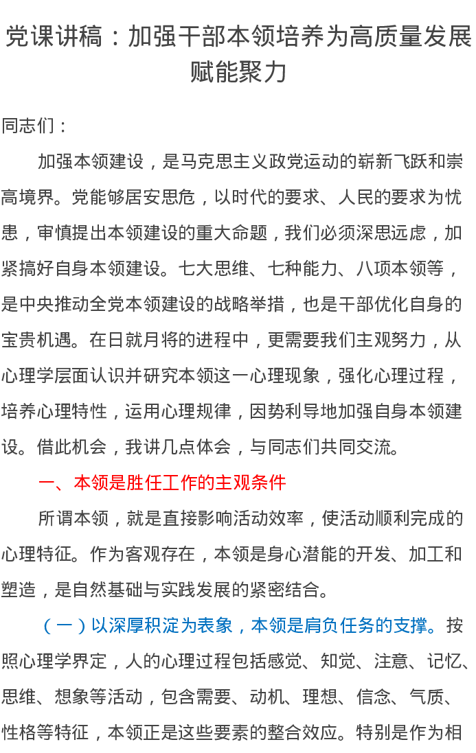 党课讲稿:加强干部本领培养为高质量发展赋能聚力