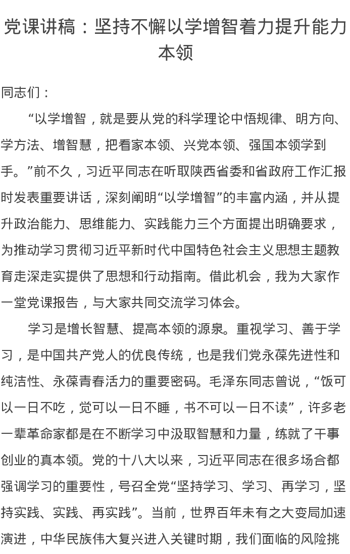 党课讲稿:坚持不懈以学增智着力提升能力本领