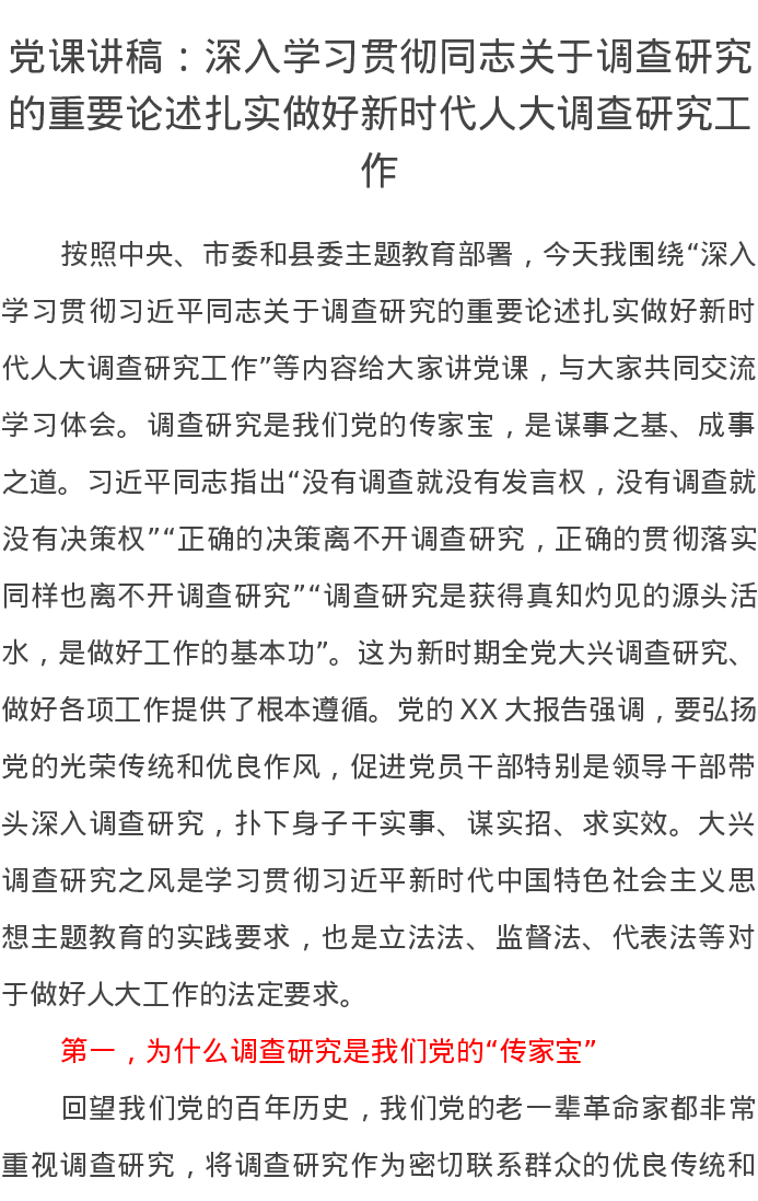 党课讲稿:深入学习贯彻总书记关于调查研究的重要论述扎实做好新时代人大调查研究工作