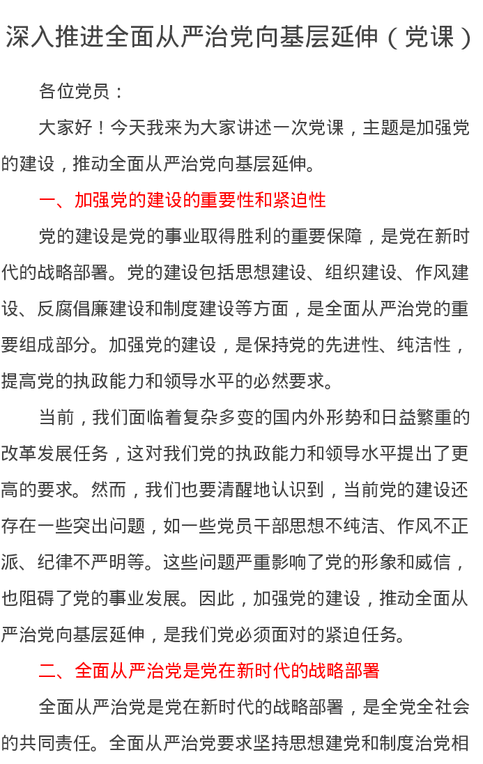深入推进全面从严治党向基层延伸(党课讲稿)