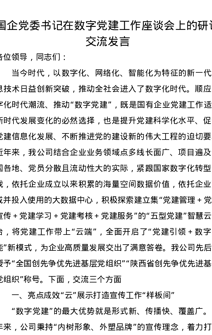 国企党委书记在数字党建工作座谈会上的研讨交流发言