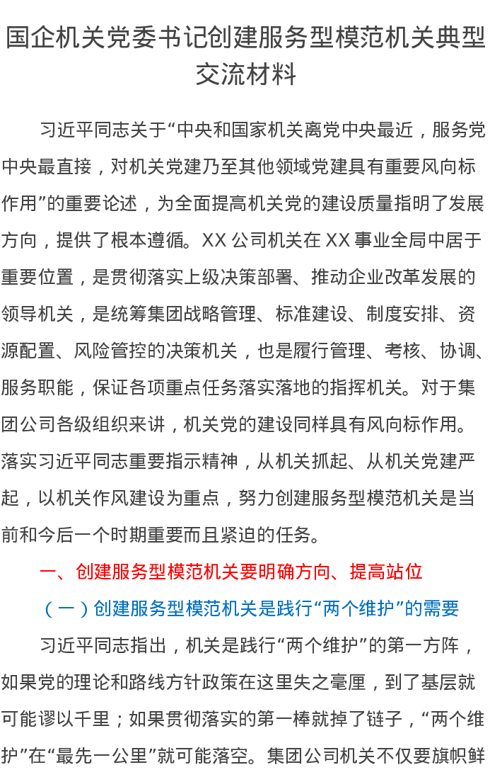 国企机关党委书记创建服务型模范机关典型交流发言材料