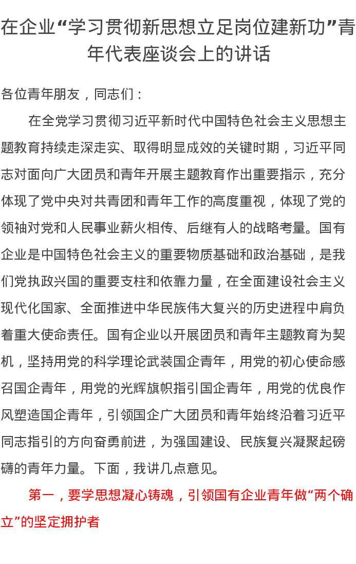 在企业“学习贯彻新思想立足岗位建新功”青年代表座谈会上的讲话